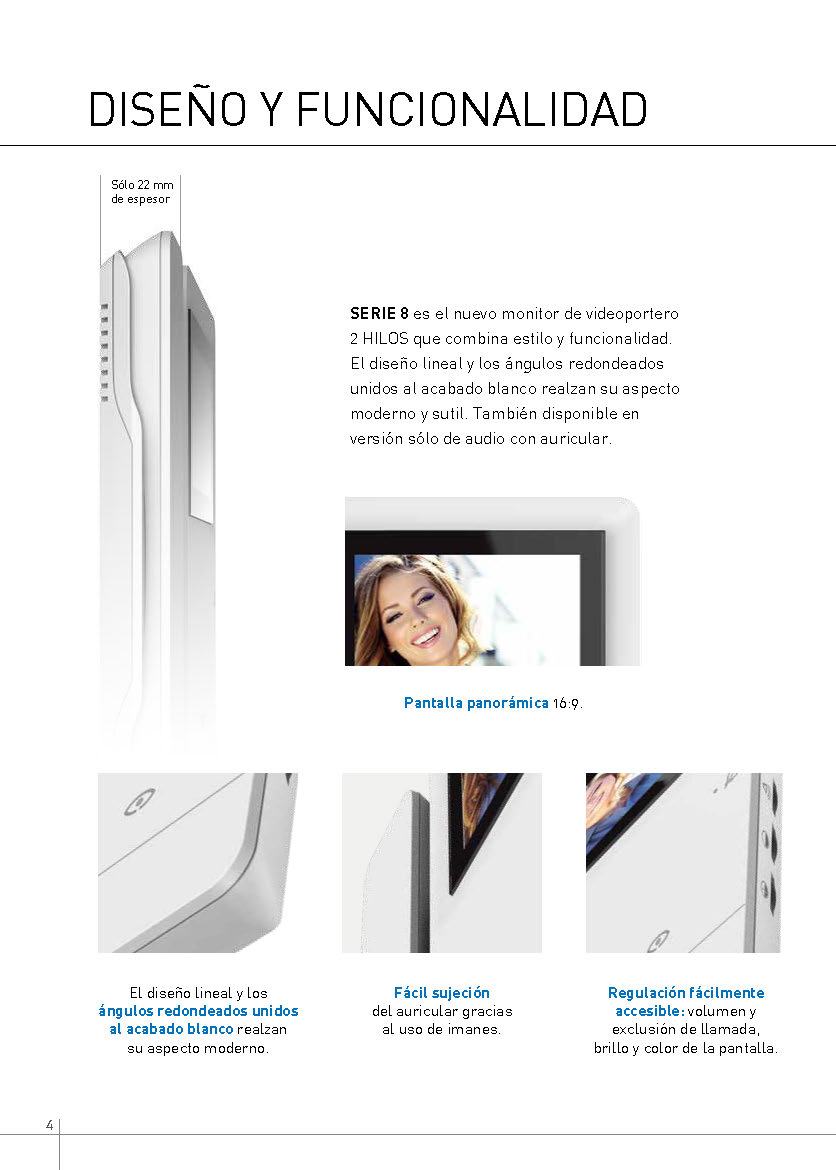 Con tan sólo 22 mm de espesor, el diseño lineal y los ángulos redondeados unidos al acabado blanco realzan su aspecto moderno y sutil, disponible también en versión portero Serie 8 audio con auricular.